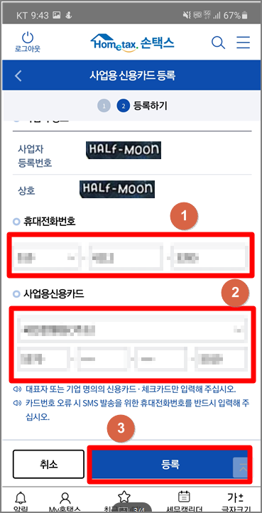 6. 휴대전화번호 입력 - 신용카드정보 입력 - '등록' 클릭