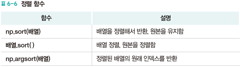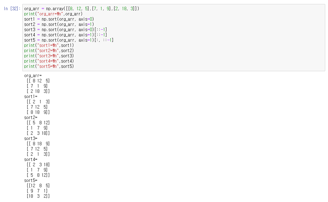 변수 = np.sort(*, axis=0) : *다차원 넘파이 행렬을 열 기준으로 오름차순 정렬한 결과를 변수에 저장