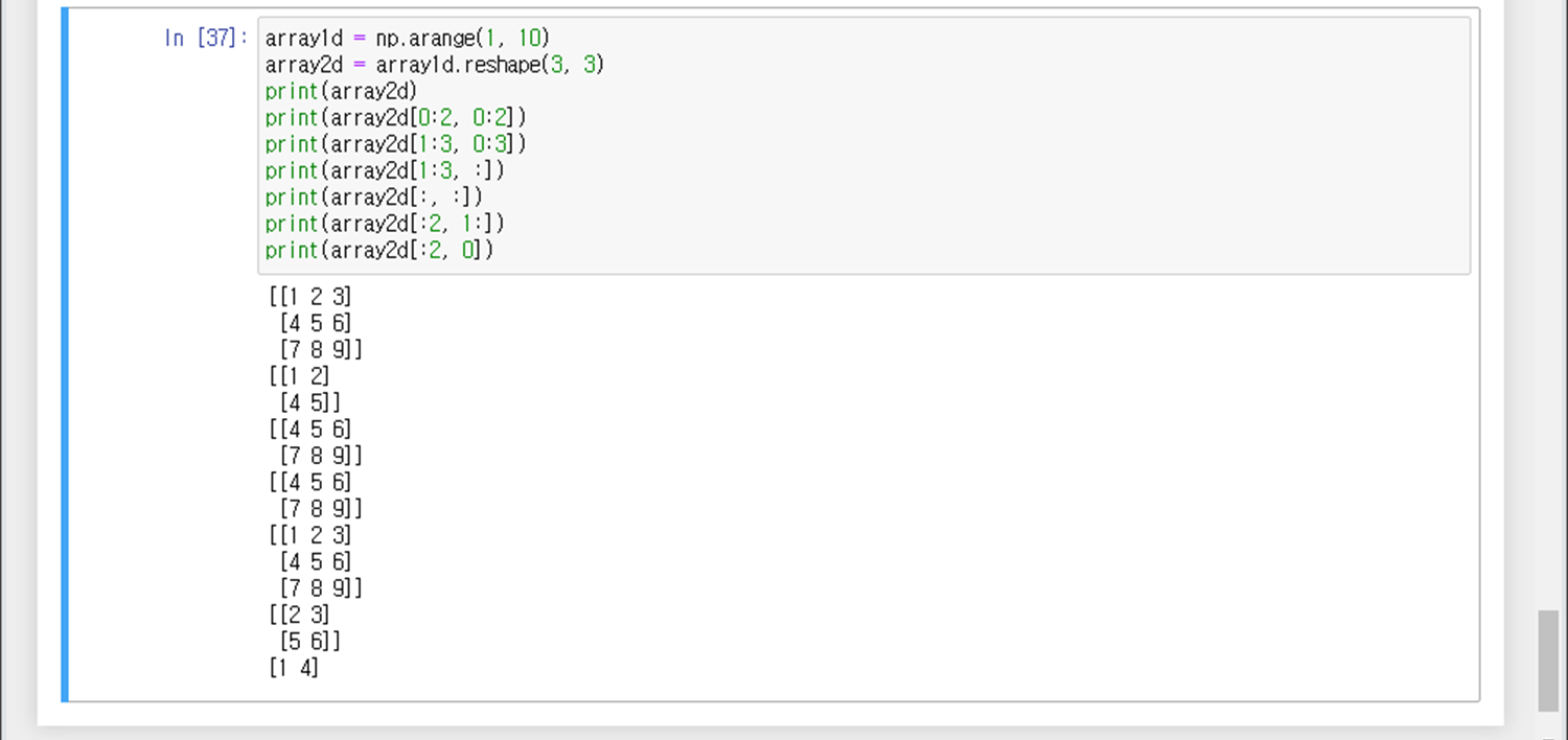 *[n:n', m:m'] = *넘파이 행렬의 n~n'-1행 m~m'-1열의 값을 출력 (0행부터 시작)
