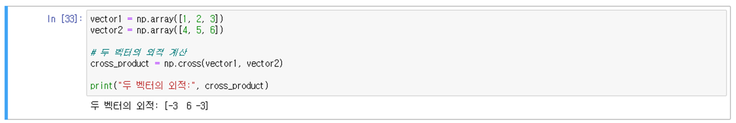 변수 = np.cross(A, B) : 행렬 A와 B를 외적하여 그 결과를 변수에 저장