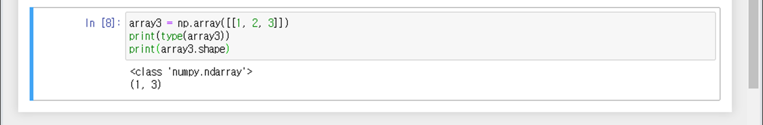array3에 넘파이 배열 [[1,2,3]]을 정의하였고, 이 타입은 numpy.ndarray 타입(넘파이로 정의된 배열타입)이며, shape는 (1,3) 즉, 1행 3열 [1,3] 행렬이라는 뜻이다.